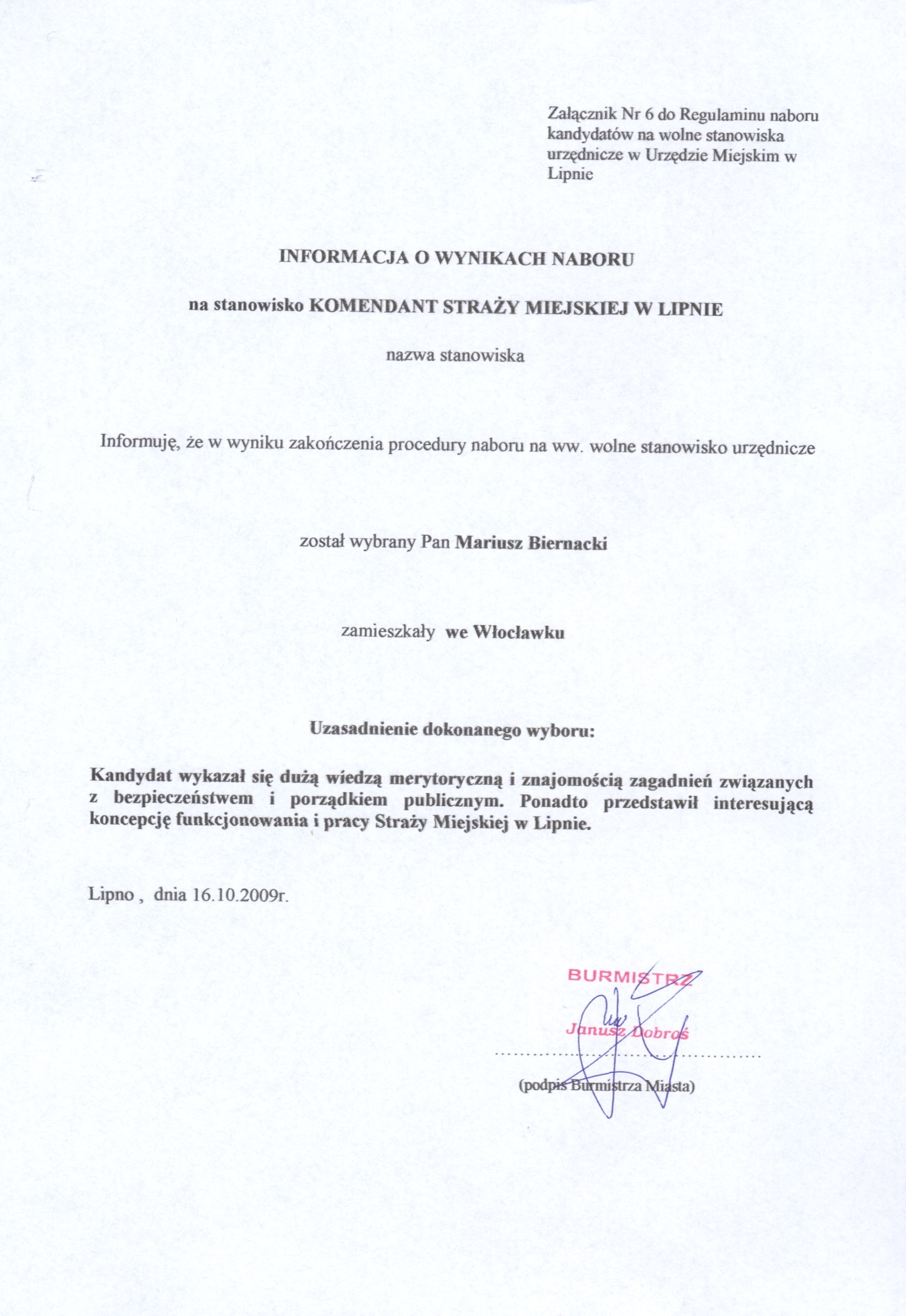 Informacja o wynikach naboru na stanowisko pracy Komendant Straży Miejskiej w Lipnie więcej